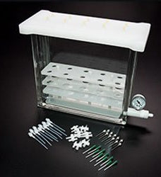 Each system includes a durable clear glass vacuum chamber, ergonomic lid, and ports for vacuum application. Optional polypropylene or Teflon® needles, adjustable sample racks, and drying attachments allow for seamless filtration and elution into various sample vessels.
